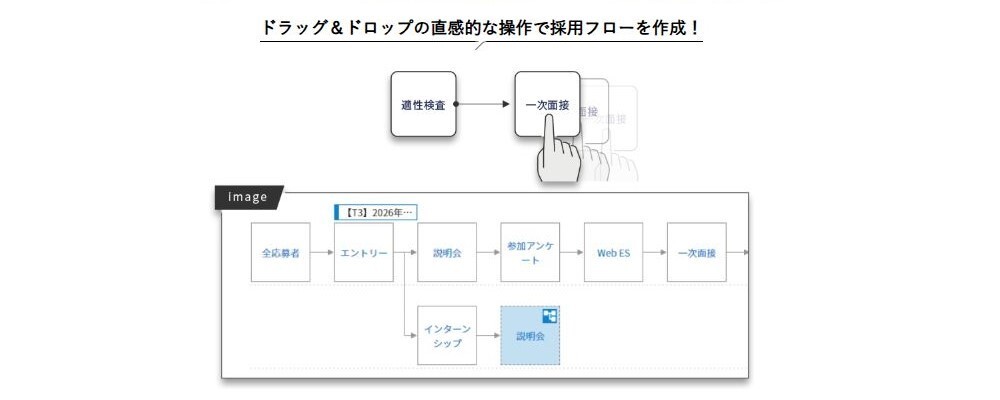 sonar ATS by HRMOSでは、応募から内定・入社までの採用フローを作成し、採用状況の確認・共有を容易に実現できるのが大きな特徴です。ターゲット・評価ごとに特別選考フローを設定することも可能です。戦略や意図を含めて設定内容を実態に近しい形で可視化できるため、採用チーム内での情報共有を高いレベルで実現できます。特別フローの設定も可能で、任意の条件に合致した応募者を、ルート設定によって意図したステップに自動で誘導できます。