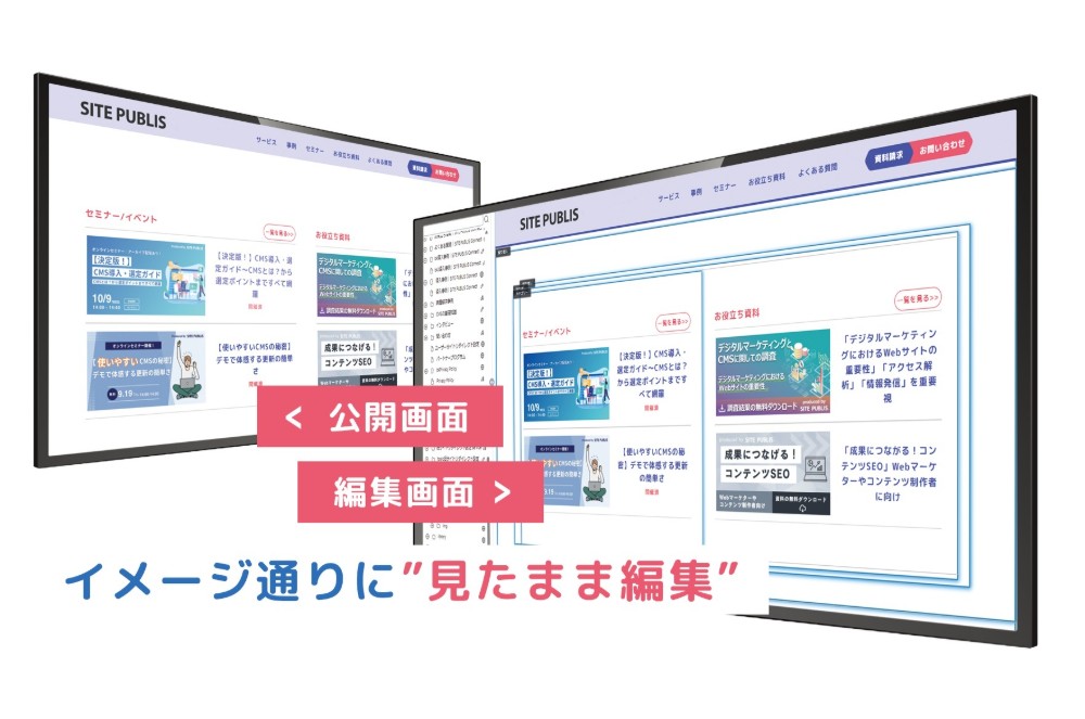 SITE PUBLIS Connectとは、小規模から中規模のWebサイト運用を格段に手軽にするクラウド型CMSです。初めてでも直感的に操作できる「見たまま編集」機能を備え、ブロックを組み合わせることで自由にページを作成できます。さらに、外部ツールやプラグインを追加できる拡張性の高さも魅力です。また、ヘッドレスCMS機能を搭載しており、従来のWebサイト運用を維持しながら、モバイルアプリ、ウェアラブルデバイス、スマートスピーカー、デジタルサイネージなど、さまざまなデジタルデバイスへのコンテンツ配信・連携が可能です。長年選ばれ続けている理由は、「導入しやすさ」「通常業務をスムーズに行えること」「業務改善を継続できること」にあります。立ち上げ支援やレクチャーサポートも充実しており、初期導入から運用フェーズまで、機能・サポートの両面で顧客に寄り添った純国産CMSです。