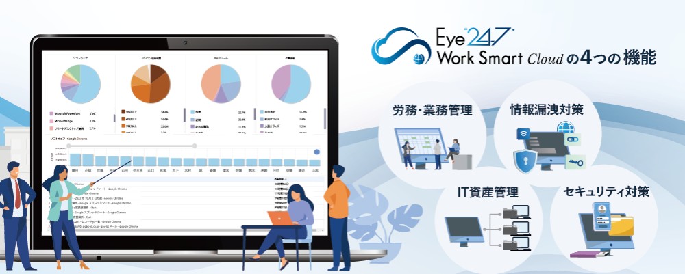 Eye“247” Work Smart Cloudは、IT資産管理、勤怠管理、情報漏洩防止などの多彩な機能を1つのツールで提供します。これまで複数のツールを利用していた企業でも、コストの削減が可能です。さらに、初期費用が不要なため、導入のハードルが低く、幅人い企業に対応できます。