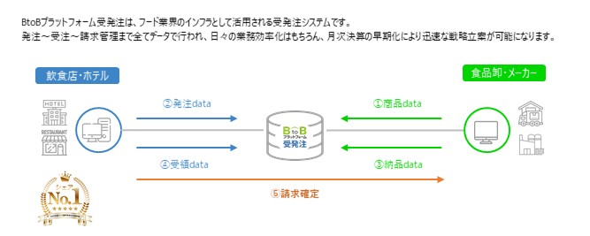 BtoBプラットフォーム 受発注とは、発注側・受注側双方の業務負担を軽減する受発注システムです。飲食店や宿泊業をはじめとする食材仕入れ側企業と、食品卸や食品製造業などの食材販売側企業がオンライン上で取引を行うことができ、従来当たり前だったFAXや電話での受発注と比較し、大幅に業務負荷・コストを削減することができます。また、売上管理・店舗支援システム、会計システムとの連携実績も豊富で、BtoBプラットフォーム 受発注で確定した仕入れデータ、請求データを連携させることで日次損益管理や、会計ソフトへの入力省力化が実現。データ連携によりワンランクうえのスピード経営を実現することができます。BtoBプラットフォーム 受発注は、単なる受発注システムではなく、飲食店経営に必要な経営基盤として役立ちます。